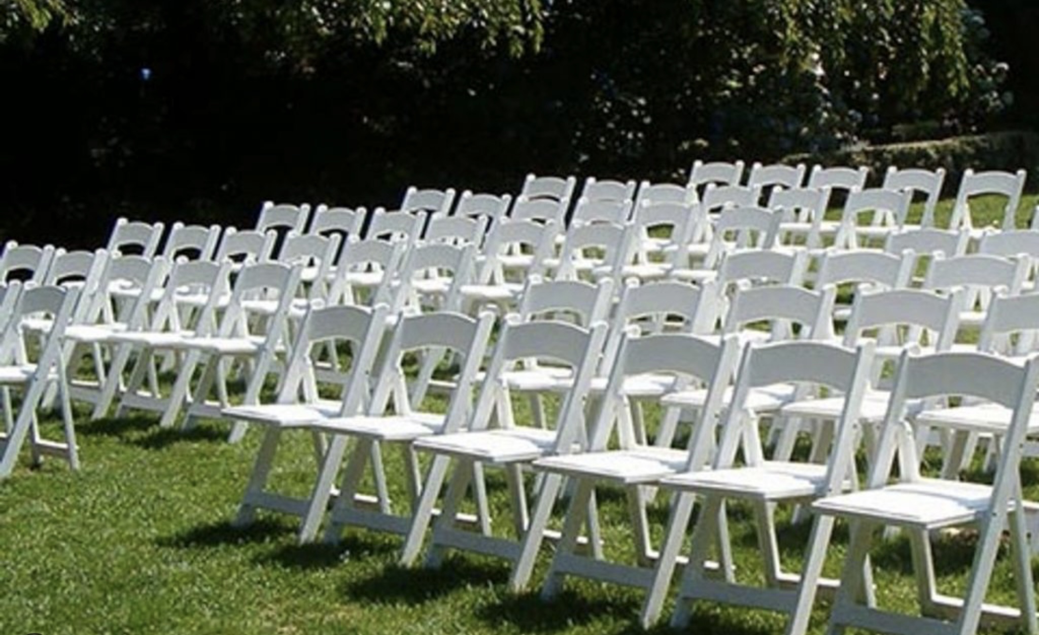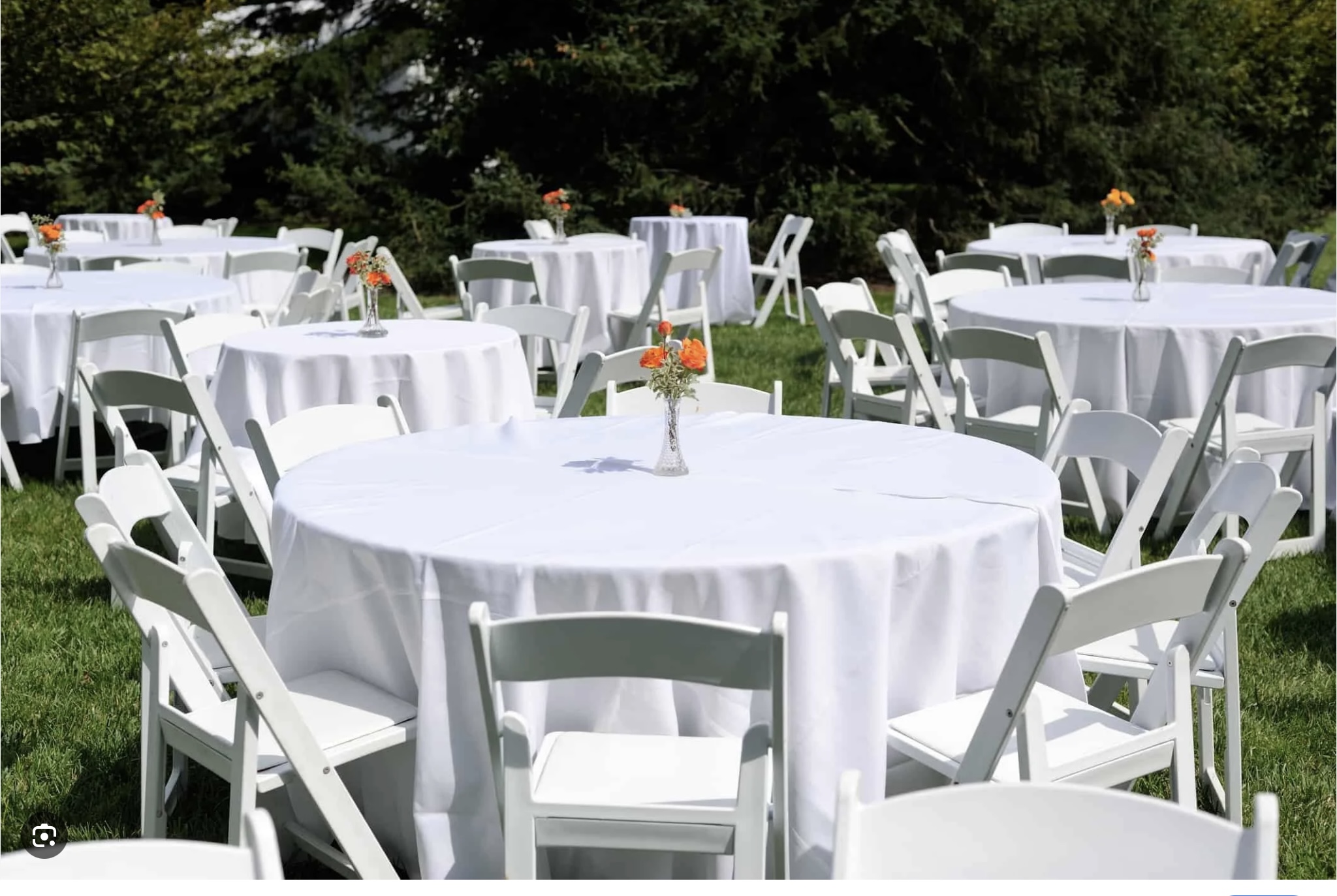 Comfortable Seating Offers white chairs with cushioned seats for elegance and comfort, alongside practical gray plastic chairs for more casual settings.