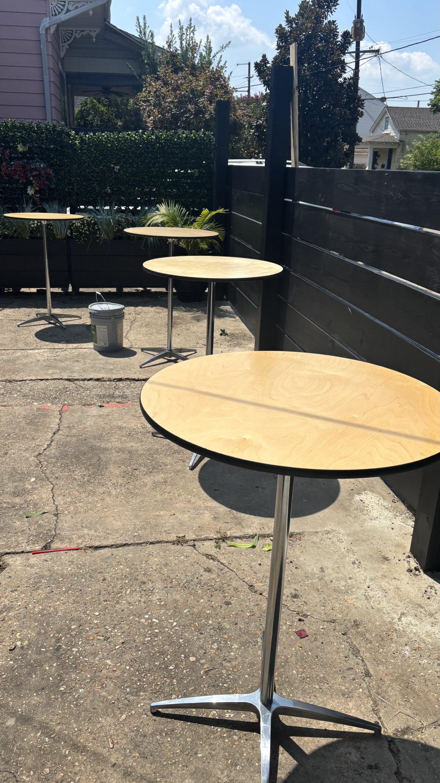 Different Table Options Includes 6-foot plastic tables with linens for a traditional setup and wooden round cocktail tables with a choice of black or white covers for a more modern feel.